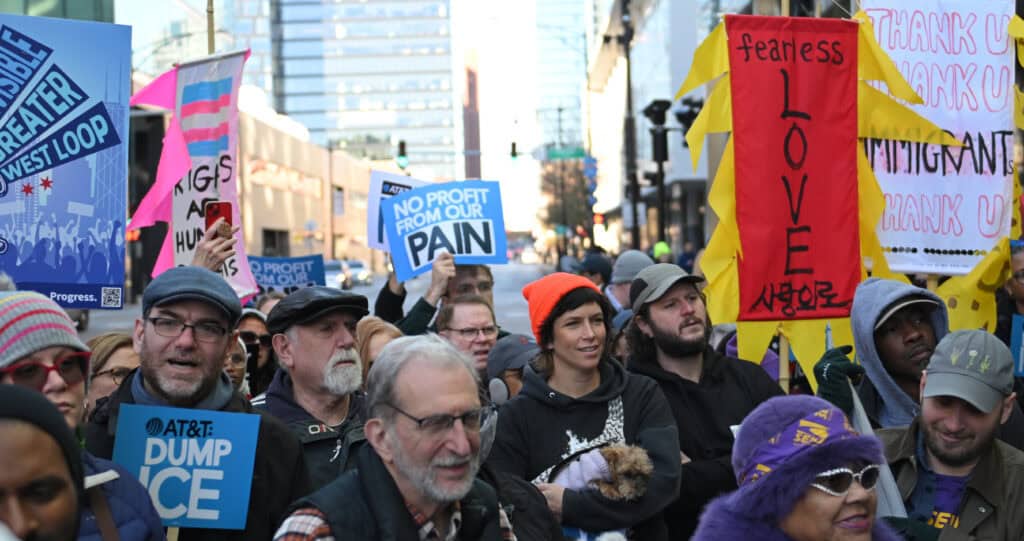 Acabamos de actuar juntos en Chicago, exigiendo a AT&T que cancele sus contratos con ICE y las agencias federales relacionadas que han intentado convertir las calles de Chicago en una zona de guerra. Han fracasado gracias a la fuerza y la valentía de las comunidades y organizaciones comunitarias de Chicago, que se defienden mutuamente y se niegan a ceder.